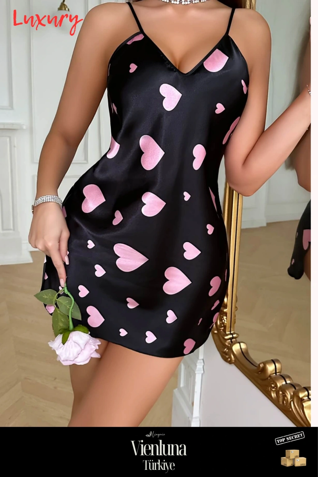 Pembe Kalp Desenli Siyah Saten Gecelik – Aşkın Zarif Hali